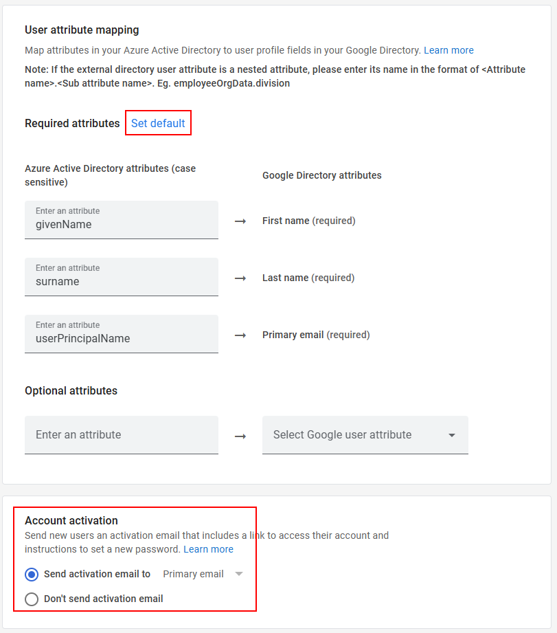- Edit the User Attribute mappings (if needed) or click set default to use the default mappings. First Name, Last Name, and Primary email address are required fields in Google Workspace. Choose whether you want to send the users an activation email, then click continue. If you already have existing users in Google Workspace, they will not be duplicated as long as the UPN in Entra matches the Primary Email in Google Workspace.