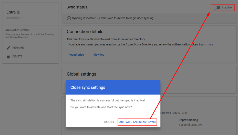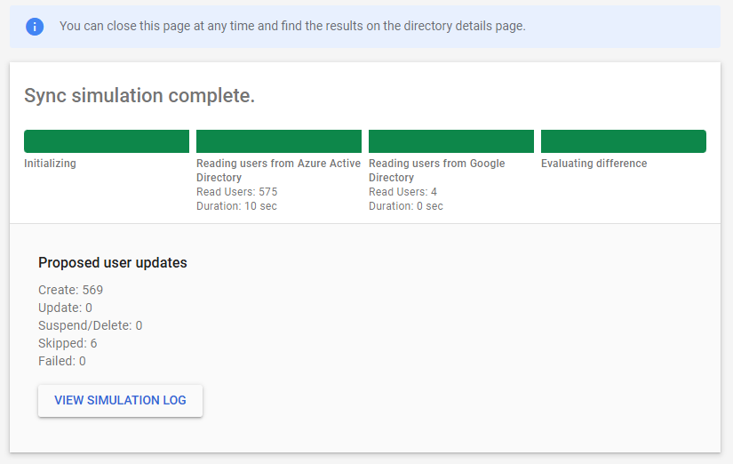- After closing the simulated sync, if successful, you’ll be asked if you want to activate and start sync. If you decide not to activate and start syncing now, you can come back to the sync directory and activate it under sync status: