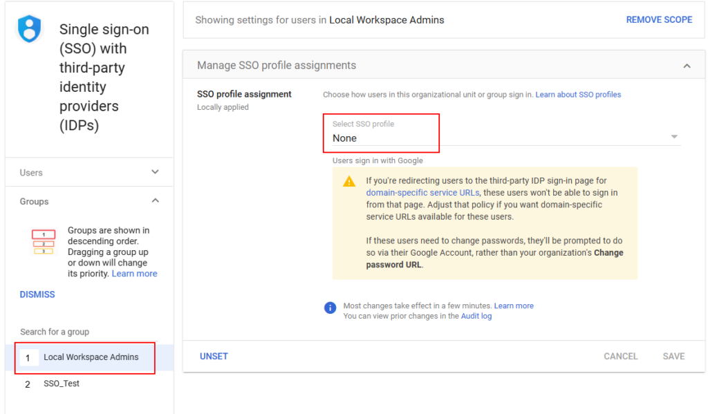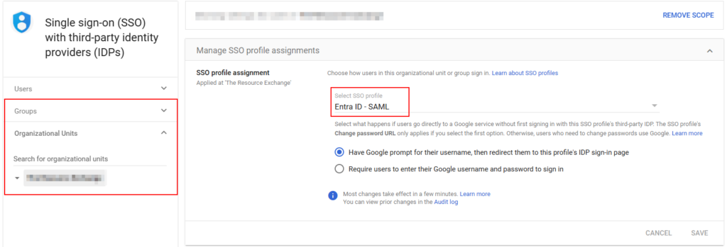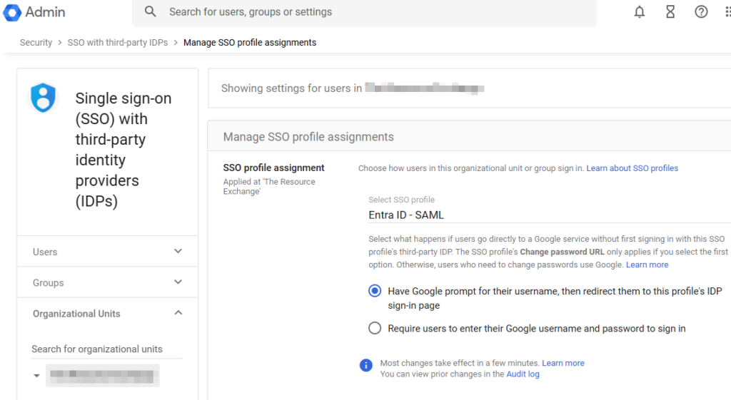 - Lastly – Go back into the Google Admin center under Single Sign-on with Third-party IDPs. Select your SSO Profile, and then scope it to the organizational level or a larger group, which will encompass all the users we just synced and all users who are assigned to the SSO enterprise app in Entra.