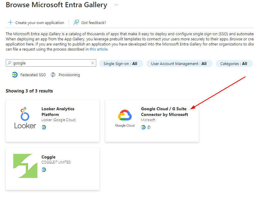 In Entra, navigate to Enterprise apps, add a new application, search for and select the Google Cloud / G Suite Connector by Microsoft: