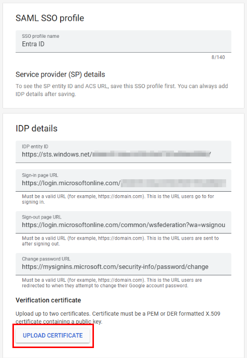 Don’t forget to upload the certificate we downloaded previously from the Enterprise App setup in Entra