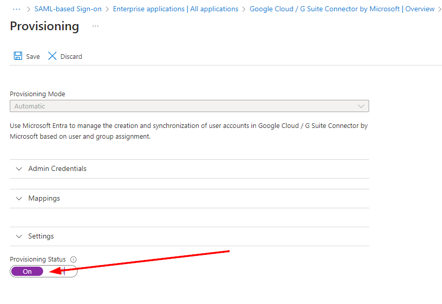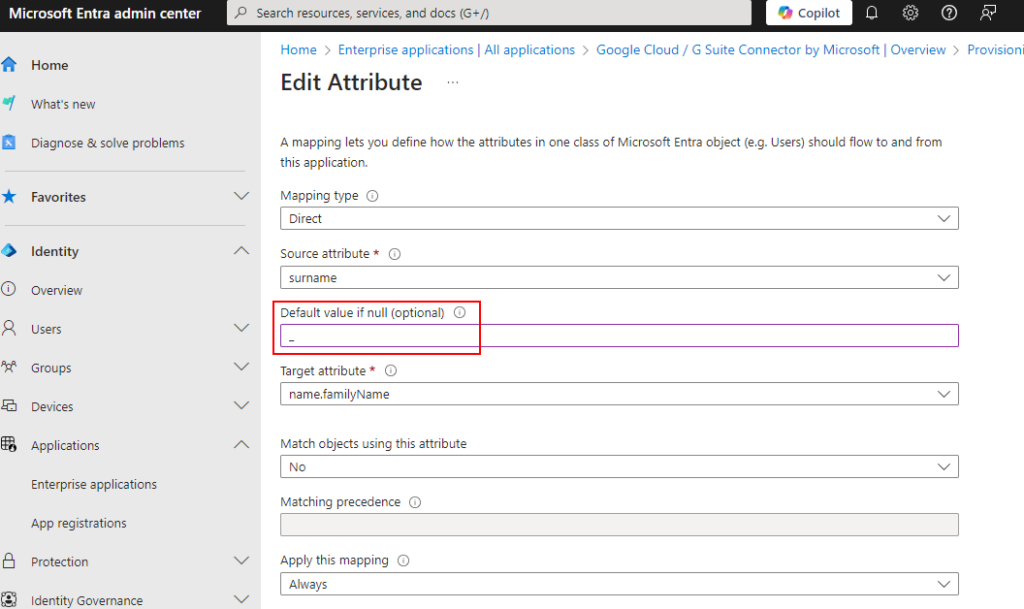 The default mappings should be sufficient, but if you want to review or change them, see this – Tutorial: Configure G Suite for automatic user provisioning with Microsoft Entra ID – Microsoft Entra ID | Microsoft Learn.