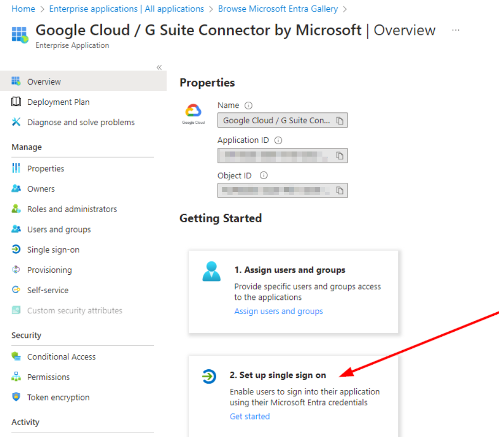 Once the app is added, we need to configure SSO. Navigate to the enterprise app we just added (Google Cloud / G Suite Connector by Microsoft). Select Set up Single sign on: