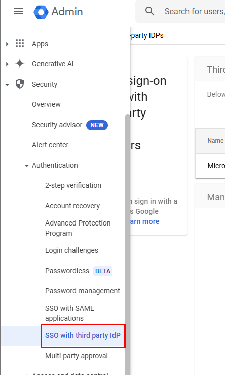 Next, sign into your Google Workspace Admin center and select Security > Authentication > SSO with third party IdP: