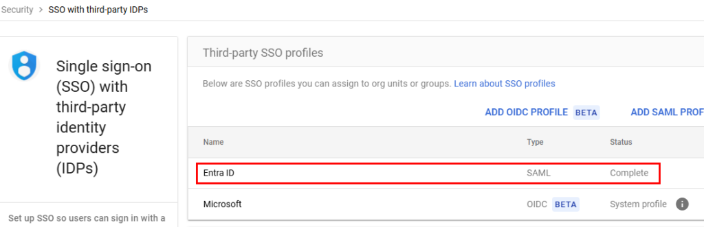 When finished, you should see a status of Complete for your entry in Third Party SSO profiles: