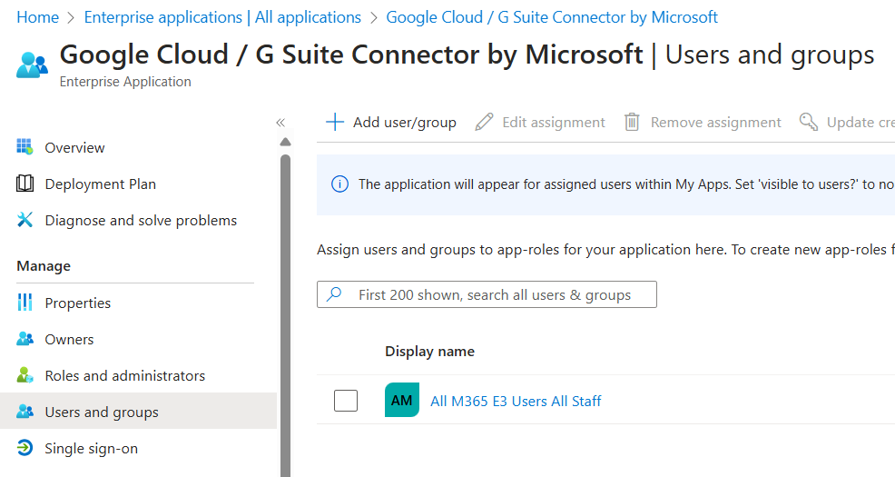 - We also need to ensure the SSO enterprise application in Entra targets the same group that our Directory Sync is using. This group should match the sync group we targeted in step 7.