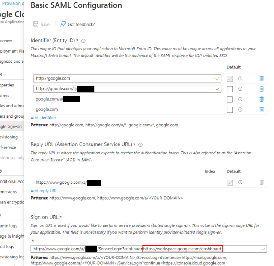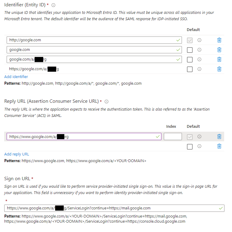 We must also add the Entity ID and ACS URL from the Google SAML SSO profile to the SAML configuration in Entra. This part is not in the MS documentation. See below: