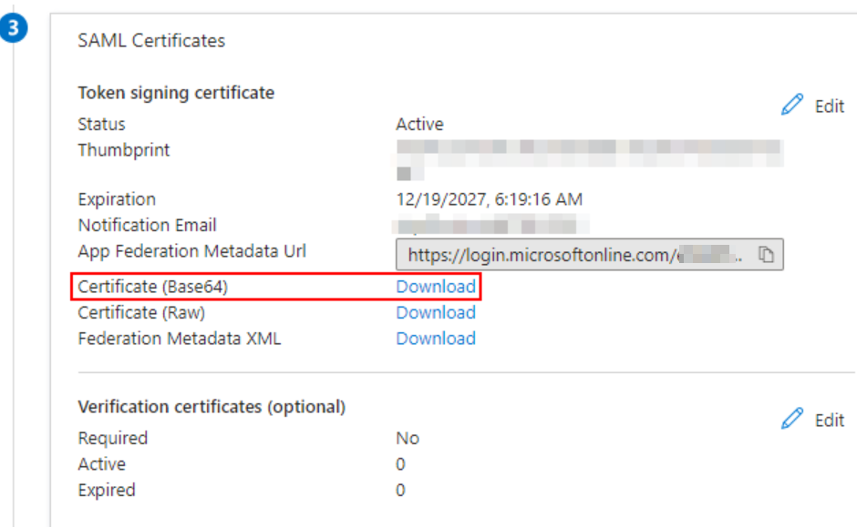 OK, so back to our configuration. There’s no need to change anything in the attributes & claims. Next, in the SAML certificates section, download the Base64 certificate: