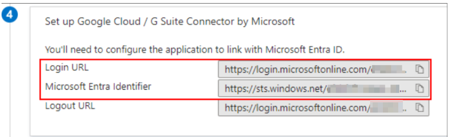 Copy the Login URL and Microsoft Entra Identifier in step 4 (shown below). Don’t copy the logout URL. Instead, use https://login.microsoftonline.com/common/wsfederation?wa=wsignout1.0 for the logout URL