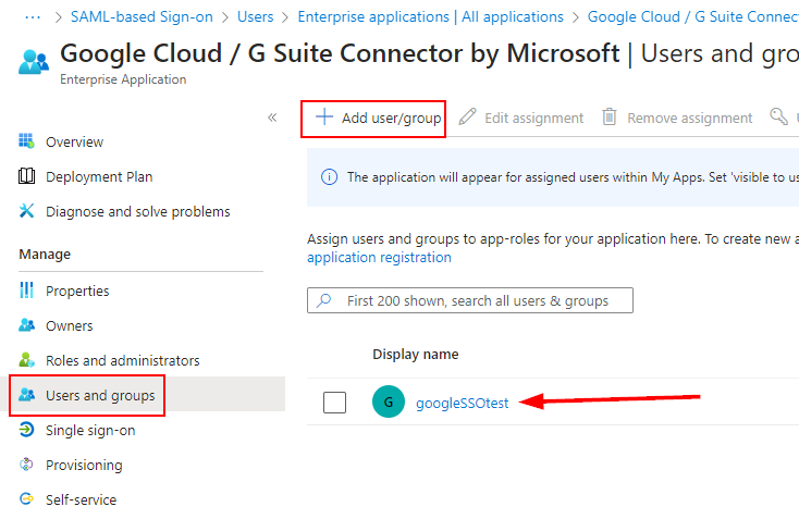 Next, if you want to test before rolling out to production users, create a test user and add to the enterprise application’s Users and Groups.
