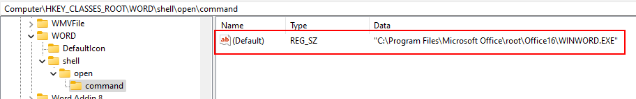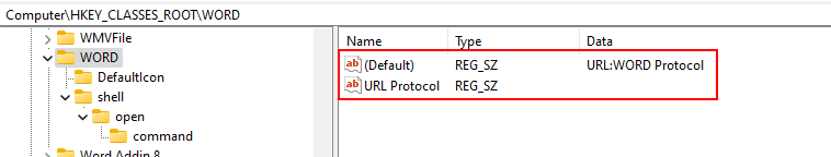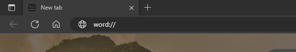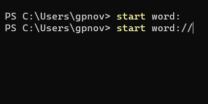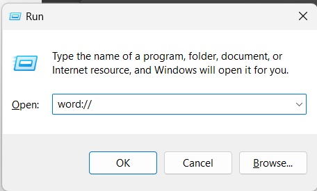 After creating the above registry entries, if we use the word URL protocol (word: or word://) it will launch Microsoft Word. We can do this from a browser, PowerShell, or a Run prompt: