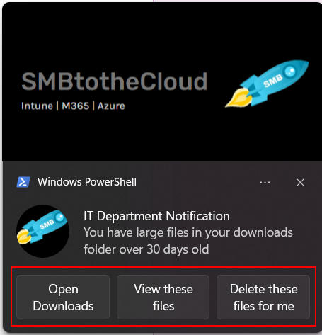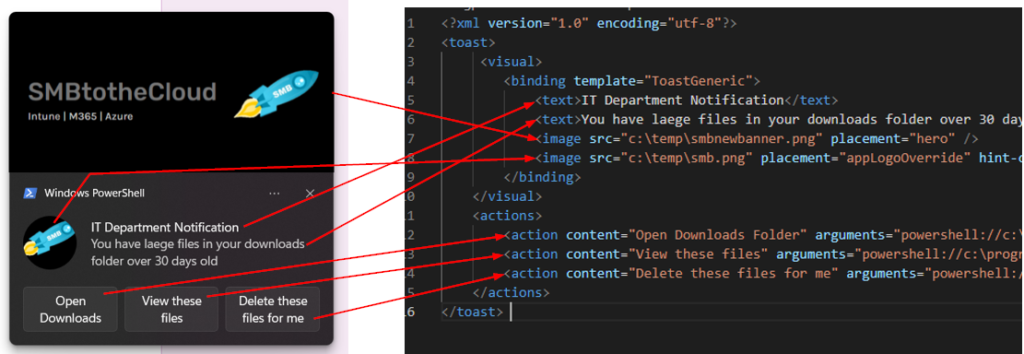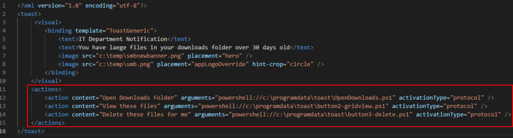 This post is a compilation of much research and testing, and there were a few resources in particular that were a huge help. If you ever want to use custom toast notifications, I hope this covers all basic steps and save you time from doing a lot of R&D. This is a deep topic, and toast notifications can be much more complex than what is covered here. My goal was to make custom notifications and have the action buttons do more than simply launch a website (which is what they do in most cases). I wanted to run custom PowerShell scripts with the action buttons. We will review the nuts and bolts of toast notifications and then walk through setting up a toast notification to check if any 30+ day-old 500+MB files exist in the user’s downloads folder. The user will have three action buttons – 1. Open the user’s downloads folder, 2. Open a PowerShell Gridview of the affected files, or 3. Auto deletes those files. All files used in these posts are available on my github. Also, I understand Storage Sense is a better solution for cleaning up the downloads folder, but this is an easy example that can be modified to do other things. Here is everything this post will cover: