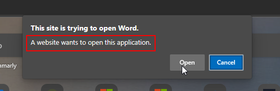 Before we move on, let’s take a step back and look at another example. A much simpler example is if we wanted to create a protocol handler that launched an application. For example, perhaps you want to send a weekly toast notification with a reminder to complete a timesheet or submit regular data to an application, and you wanted that application to open with a toast notification button. If we use Microsoft word as an example, we can make a protocol handler for word:// to launch Microsoft word: