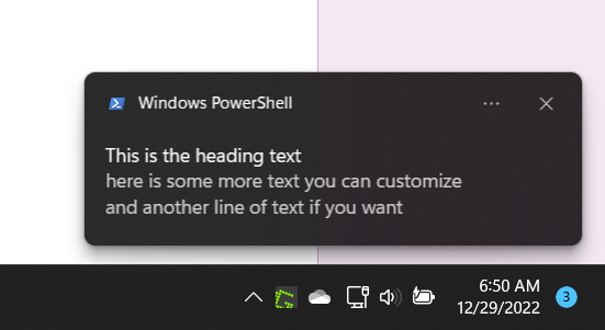 Note that we have an AppID variable. This is a required field and displays on the Toast Notification as the app where the notification came from. We can get a list of these by using the PowerShell command Get-StartApps. You can use the AppID value for the App you want to use as displaying the notification. I use Windows PowerShell as the app, but this quick example shows how we can change it to something else.