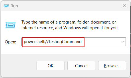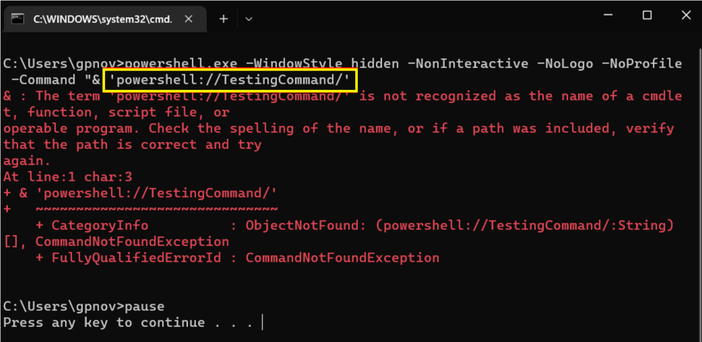 We can see how the script interprets this if we remove the .Replace(‘powershell://’, ”).Trim(‘/’)” part of the script, add a pause at the end, and then try passing some characters. An example is below. I’ve shortened the toastscript.cmd so it no longer contains “.Replace” and everything after, and added a pause so the window stays open and we can see what happens. You can see below the URL “powershell://testingcommand” was successfully passed into our toastscript.cmd in place of the %1 variable.