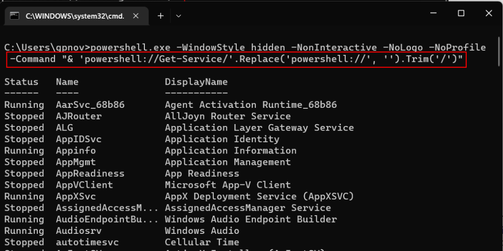 Now that we have tested the script and passed the variable so we can see it’s working correctly, We need to strip some of the characters out so it represents real PowerShell syntax. If we consider the example above, we need to get rid of these highlighted characters – ‘powershell://TestingCommand/’ which will then leave us with only what we add after the URL handler – powershell://TestingCommand. To accomplish this, we add the .Replace(‘powershell://’, ”).Trim(‘/’)” back to our script, which will remove our unneeded characters. To demonstrate, we will use the get-service cmdlet. Our complete toastscript.cmd is shown below along with the example. I am leaving the pause in the script so we can see the output, but remember to remove the pause once you’ve tested successfully.