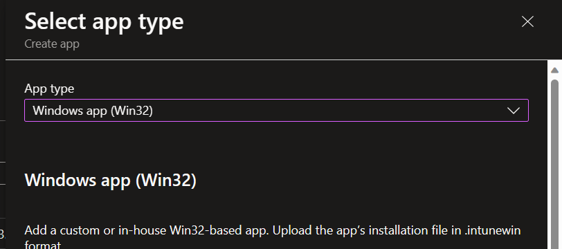 - When prompted for which type of app, select Windows app (Win32) from the dropdown, and click the select button