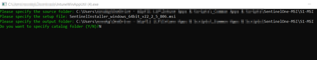 - When prompted for the source folder, enter the folder path containing the MSI installer (and no other files) from step 3. When prompted for the setup file, use the full name and extension of the SentinelOne MSI installer. For the destination folder, you can use the same folder where the MSI file is located. Enter N when asked to specify a catalog folder and press enter. It may take 5-10 seconds for the utility to finish packaging the installer.