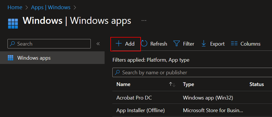 - From the Intune dashboard, Navigate to Apps > Windows and select +Add from the top menu: