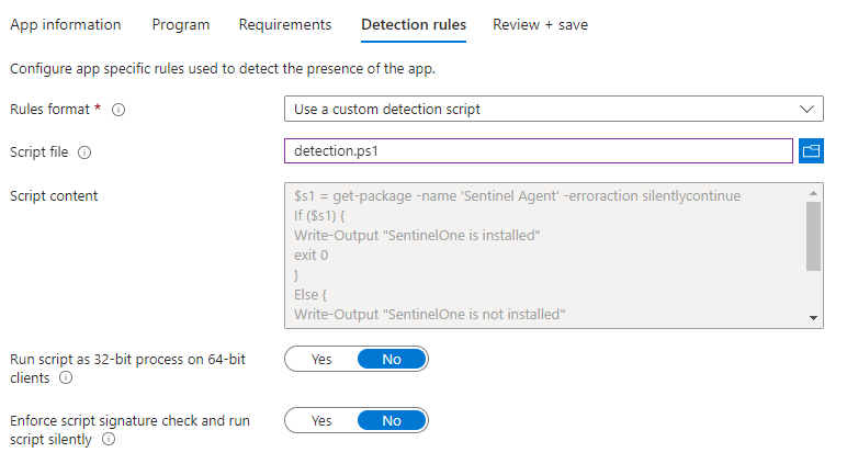 - Under detection rules, we should use a custom detection script. The MSI GUID is susceptible to change over time as new versions are released, which will result in false negatives with installation status. We can use either of the below custom detection scripts. Either will accomplish what we need. One looks at the installed software list and the other looks for the sentinelagent service: