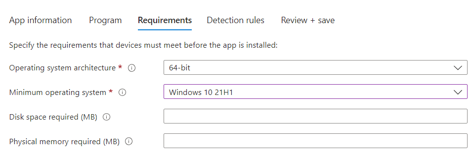 - Complete the requirements section with your OS architecture and minimum level of Windows. If you have additional requirements in your environment, you can add them here.