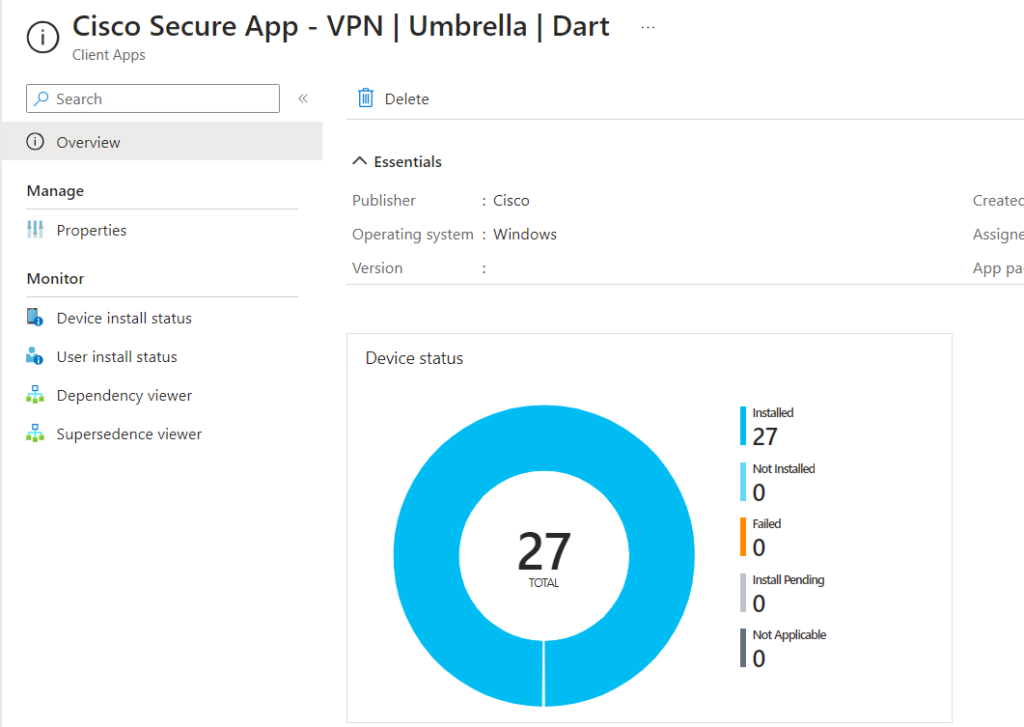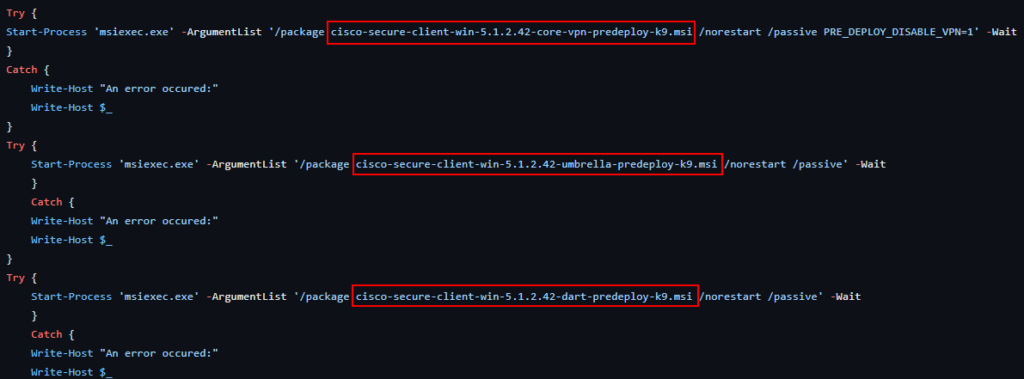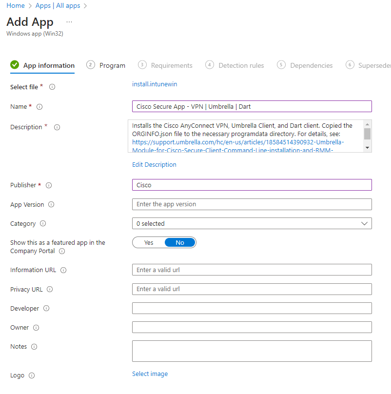 Several months ago, I made a post on how to deploy the Cisco Umbrella Roaming client with Intune. Well, just recently Cisco announced the end-of-life dates for the Umbrella Roaming Client, and April 2, 2025, is the end of servicing & support (End-of-Life Announcement for the Cisco Umbrella Roaming Client). The replacement software is the Cisco Secure Client with the Umbrella module (How do I install Cisco Secure Client with the Umbrella Module? – Cisco Umbrella). This post will walk through how to install all three of the recommended application components as a single Win32 app. If you’re still deploying the Cisco Umbrella Roaming client, you should start using the Secure Client with Umbrella module. Also, per the Cisco documentation linked above, the secure client will automatically detect if the Roaming Client is installed, and if so, it will migrate those settings to the Secure Client Umbrella Module and uninstall the roaming client. So, we can use this guide for fresh installs and environments that need to transition from the Roaming Client to the Secure Client.