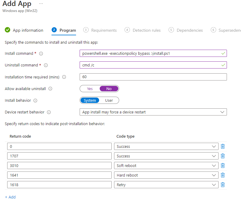- For the detection rule, select to use a custom detection script. Browse to the detection.ps1 file we downloaded earlier (or available here). It should look like the screenshot: