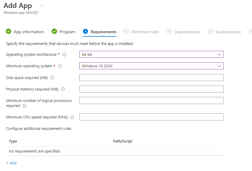 - Under requirements, specify 64-bit architecture, and select a Minimum version of Windows 10. Click next to proceed.