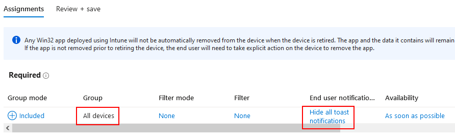 - Proceed through the rest of the sections until we reach the assignments. When you reach assignments, assign to the desired group, which is usually all devices. If this is being deployed to existing devices, you may want to suppress any user notifications by selecting “Hide all toast notifications”. Click Save to complete the app setup.