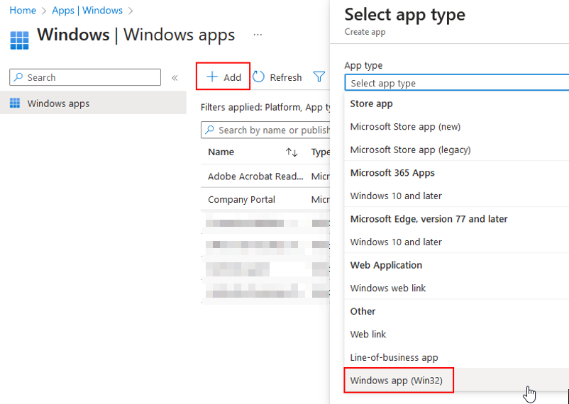- Sign into Intune (https://intune.microsoft.com). Navigate to Apps > Windows and click the +Add button at the top of the page to create a new app. Select Windows app Win32.