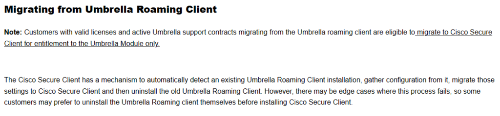 Cisco suggests deploying three total applications for Umbrella to function (Umbrella Module for Cisco Secure Client – Command Line installation and RMM reference – Cisco Umbrella):
