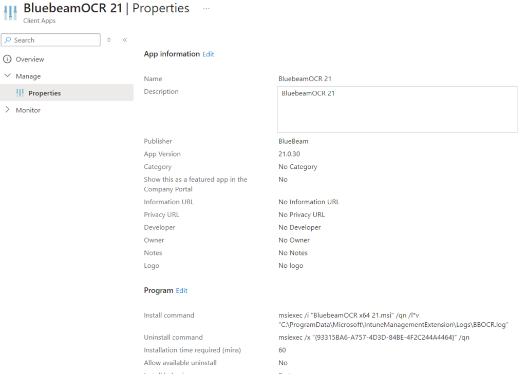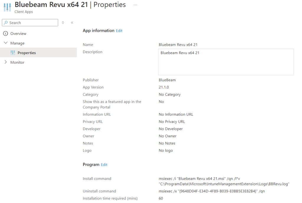 I recently had to deploy Bluebeam Revu 21 with Intune, so I figured I’d make a quick post about it. Plus, the official deployment guide contains instructions for deploying with Config Manager but does not have instructions for Intune. The software installation is straightforward, but a couple of prerequisites must be satisfied.