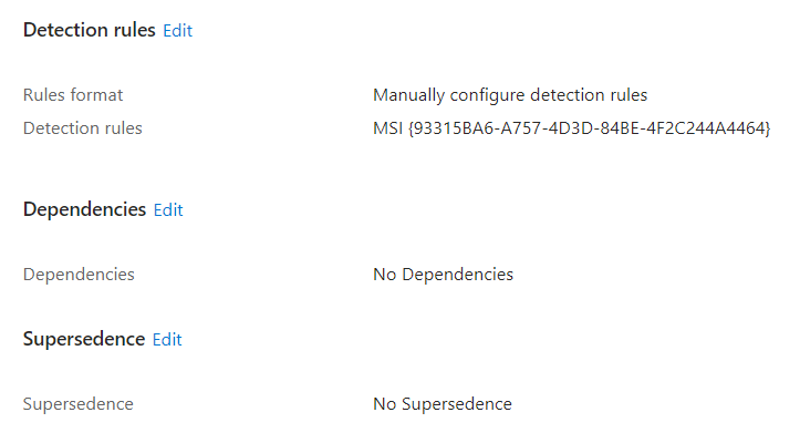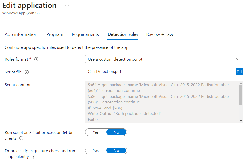 Create a new Win32 app in Intune and upload the intunewin file we just created. Make your application with the install command below and use this custom detection script for your detection method.