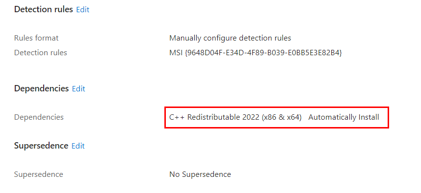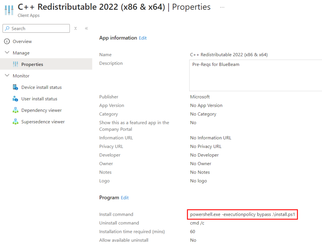 Assuming your Windows versions aren’t terribly out of date, we don’t need to worry about the .NET framework 4.8 requirement. However, there’s a chance your devices don’t have the Visual C++ Redistributable pre-reqs. To deal with those, we will use a separate Win32 app and make it a dependency for the BlueBeam install.