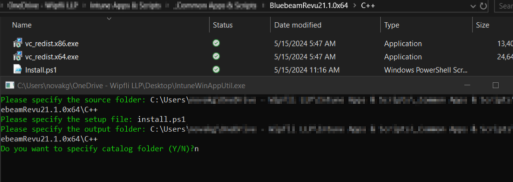 Place the “Bluebeam Revu x64 21.msi” file and the “BluebeamOCR x64 21.msi” from the installation package into their own directories with no other files. Wrap them as intunewin files following the same process we did earlier for the C++ redistributable installers.