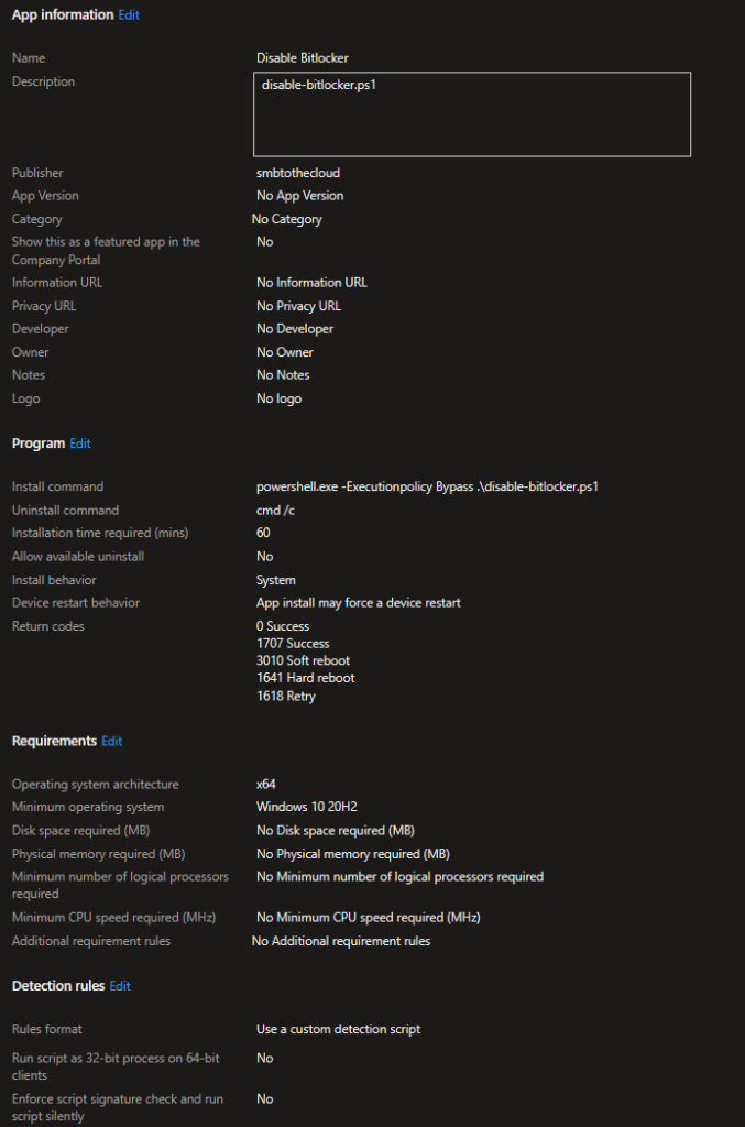 The script is fairly simple and is available on GitHub. For this specific client, we only had system drives to deal with. If you also have data disks, you’ll need make some edits to add the drive status for additional disks. First, the script checks the status of drive encryption. If the status shows that the disk is fully encrypted, then BitLocker is disabled. The Script continues to run and loops every 15 seconds to check the decryption status. We need to do this, so the detection script doesn’t run before decryption is completed. If you happen to run this manually, you’ll also see the percentage as output. If you’re wondering what happens if the system is rebooted while decryption is in progress, it will continue where it left off after the reboot.