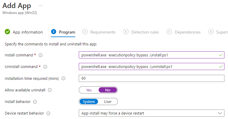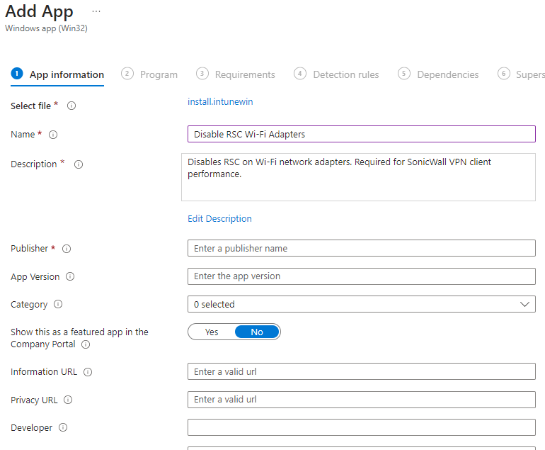 Download the .intunewin file from the link above, or modify the script as needed and repackage as a .intunewin file. Create the new Win32 app in Intune.