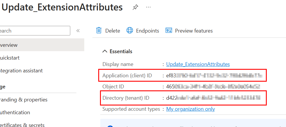 That wraps up the App registration. If you’re not familiar with authenticating with an App Reg, in addition to the client secret value, you’ll also need the tenant ID, and the client ID. Both of those are easily retrieved from the App Registration’s overview: