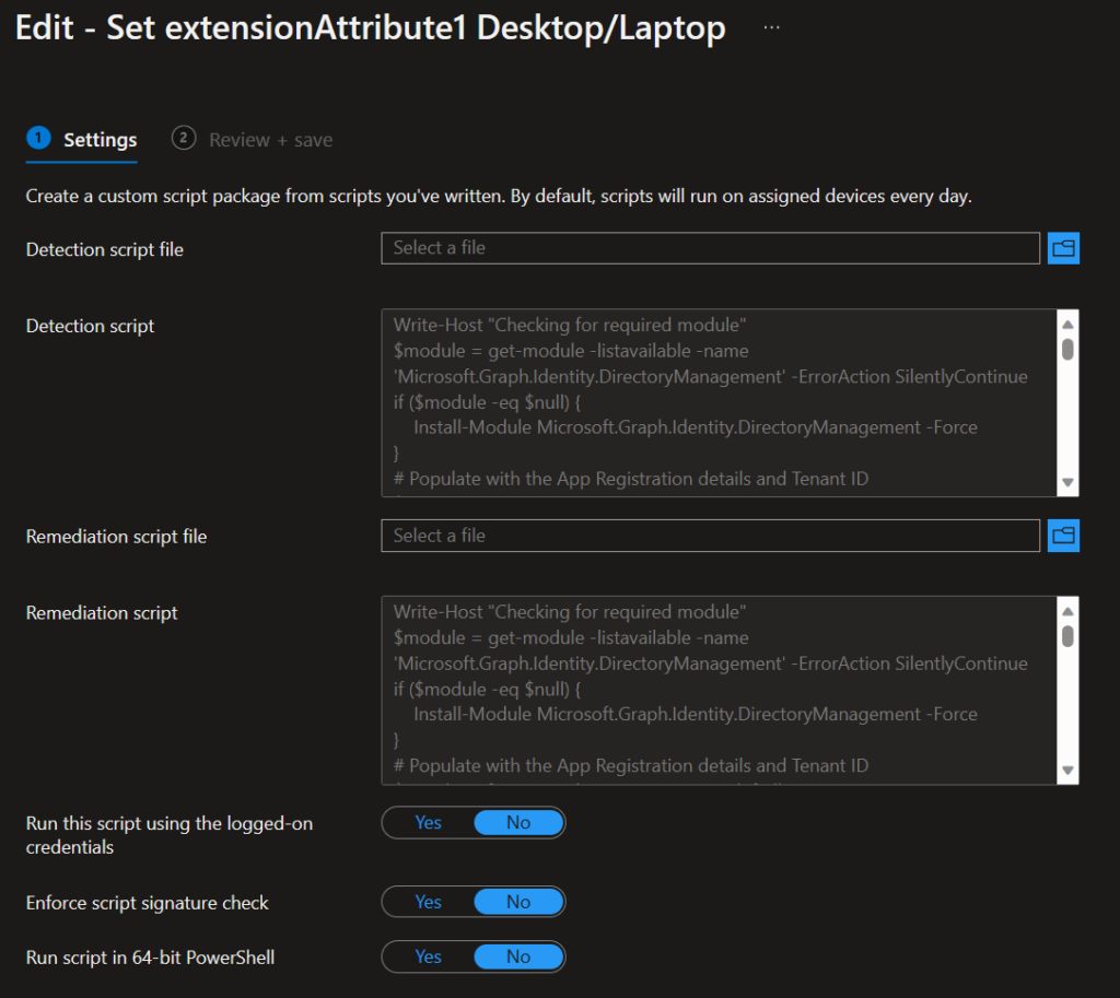The script looks for a WMI property, in this case, if a battery is present, and then determines if the extensionattribute is already set on the computer object in Azure AD. If not, it will fail detection and the remediation script will run. The detection script is shown below and also available on Github here. You’ll need to make some changes depending on what you’re trying to identify, but the important part is to make sure your $attributevalue is set properly under the if statements, depending on the output from the $battery variable. This is what will be compared against the device attributes in Graph for the device.