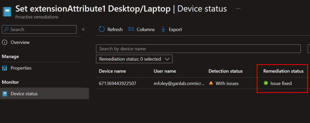 After it runs against some devices, you’ll see the device status output showing the remediation was correctly ran, setting the extension attribute.