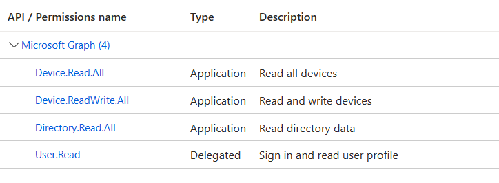 Create your app registration in Azure. This is straightforward. Provide a name, and then grant the below permissions. I’ll use one App Reg for both the detection and remediation scripts. Add the below permissions: