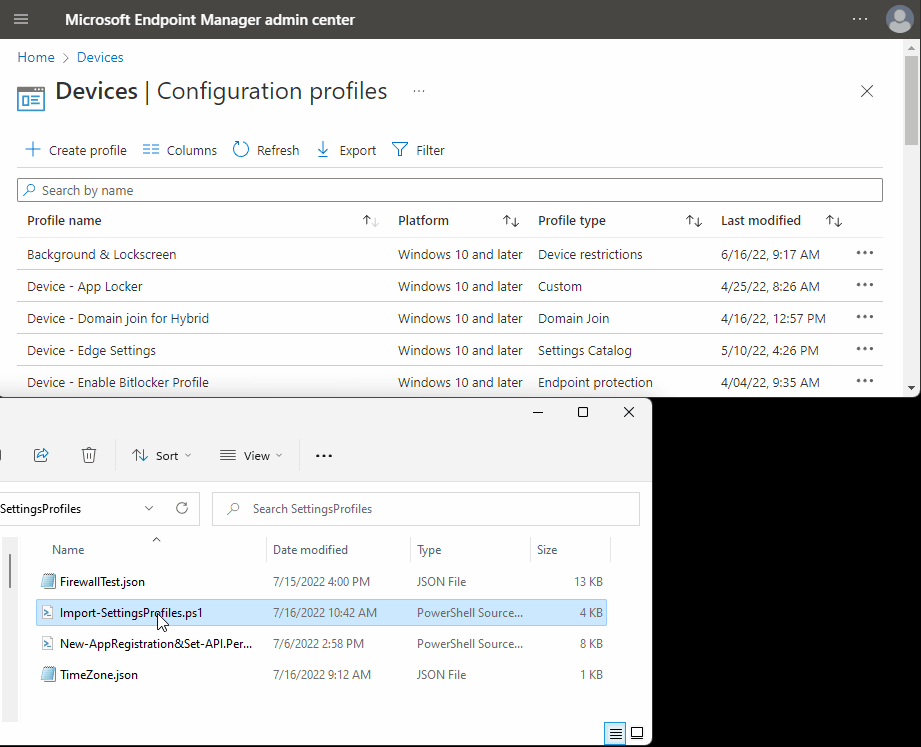 We can repeat this syntax in our PowerShell script so numerous policies can be imported with a single script. Here is a GIF of the script in action. In the GIF example, I have two policies named “A settings catalog policy”, and “another settings catalog policy” and you can see them populate at the top of the configuration profile list when the script finishes. This script is available on github. You’ll just have to edit for your profiles.