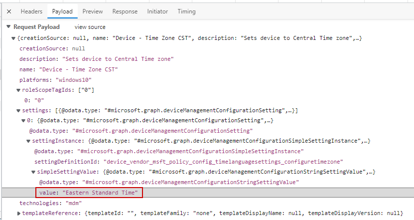Now that we have the correct request, if we navigate to the Payload tab, we can see the data sent in the request. If you expand settings, you’ll see the settings values. Normally this policy sets the time zone to Central, but I changed the value to Eastern when I edited the policy to make sure I had the correct request data: