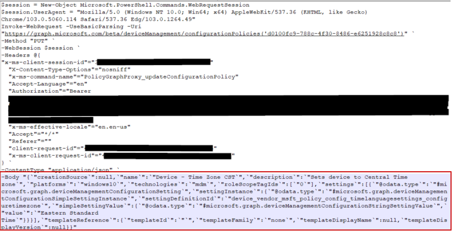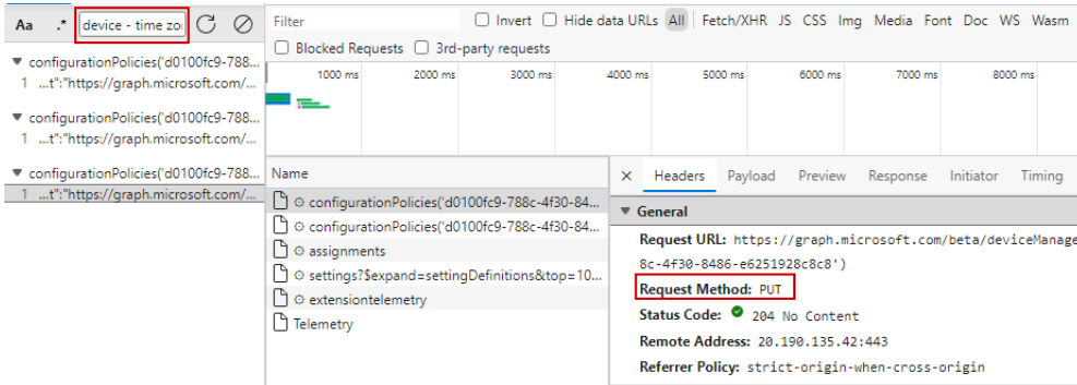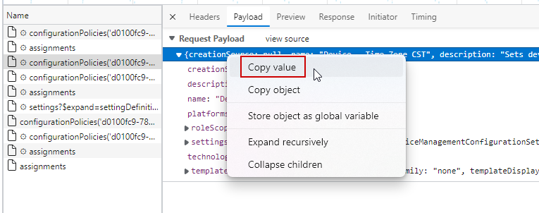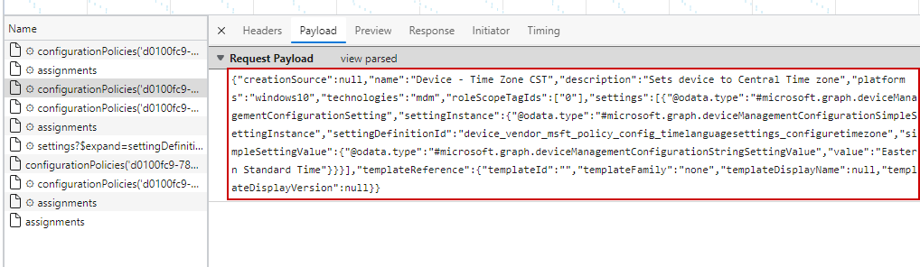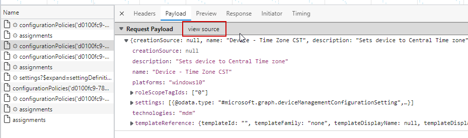 I eventually gave up with graph x-ray and started exploring the Edge developer tools to see what else I could find. You can open the Edge developer tools be pressing CTRL+SHIFT+I, or selecting More Tools > Developer options from the settings drop down. I felt like if I could get the JSON from the PUT/POST requests, I could try importing the JSON with a POST request to create a new settings catalog profile. I learned a lot from this experience, specifically using the network tab in Edge developer tools (Inspect network activity – Microsoft Edge Development | Microsoft Docs). It’s a lot messier than using the graph x-ray extension, but you can see the graph API requests. After some experimenting and testing, I had an idea of what I was looking. In the network tab of the developer tools, I started capturing network activity, edited one of my settings catalog policies, saved the changes, and stopped the network activity capture. As I mentioned, depending on the length of your capture, you may have hundreds of log entries to choose from. It can get messy. Luckily, there is a search tool (there is also a filter tool once you know what you’re looking for). I typed the beginning of my policy name (Device – Time Zone) to see what pulled up. I knew I wanted to find the PUT request for the for that profile. The search returned three results, one of which was the PUT request. You can see below where the search bar is, and the PUT request in the header details. Note: You don’t need to make a change to the policy to get these results. All you need to do is edit the configuration profile and click review + save without making changes. You will still see a PUT request with no changes made to the profile.