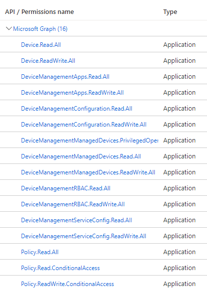Now we have a JSON file with the settings catalog configuration. We can attempt to import this into Intune and see if it creates another device configuration profile. Before we can do that, we need to make an app registration so we can connect to the graph api. In my previous post, I described how to automate this with a PowerShell script. The app registration I use for this is the same one I use for importing/exporting other Intune policies, so there are some more permissions assigned than what is necessary for this exact task. Its available on github. Refer to my previous post if you want to use this script, otherwise, manually create your app registration and generate a secret key. The API permissions my app uses are below: