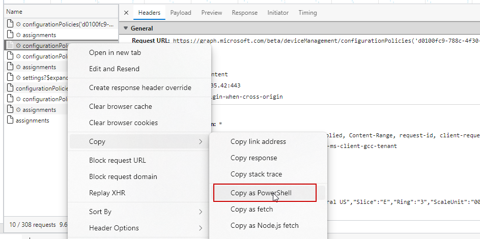 However, I stumbled on something else while doing more testing with the developer tools that makes importing multiple profiles much more efficient. If you navigate back to the Edge developer tools and open MEM. Start capturing network traffic, edit a settings catalog configuration settings, and click review + save (remember, you don’t need to make a change to the policy). Find the PUT entry (or post if it’s a new policy) in the developer tools like we did earlier. Right click that entry, choose copy, and copy as PowerShell. Paste your results in your PowerShell editor, and you’ll see the results are very similar to the script we used earlier to import our JSON file.