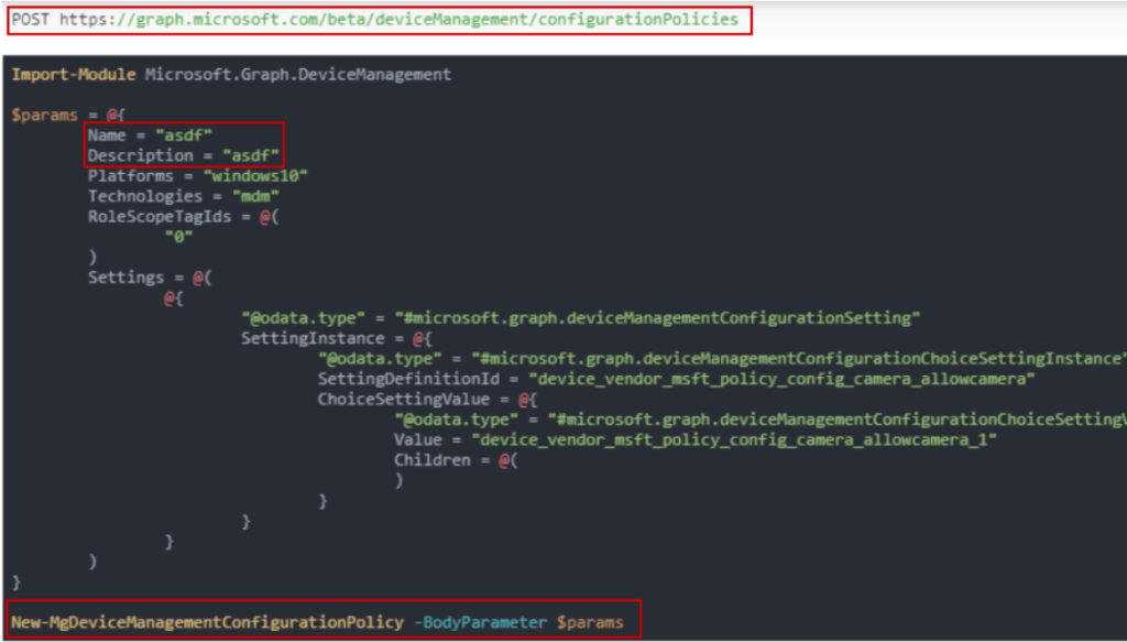 I went back into my MEM tenant and started poking around MS Graph X-Ray. At first, I thought this would be easy after seeing the exact PowerShell syntax to run when I created a test policy with the name asdf (see x-ray output below). But…. when I tried manually connecting to graph and running this in PowerShell, Set-MgDeviceManagementConfigurationPolicy was not recognized even after installing the Microsoft.Graph.DeviceManagement module. Googling didn’t provide much help either. That cmdlet isn’t even listed in either module: