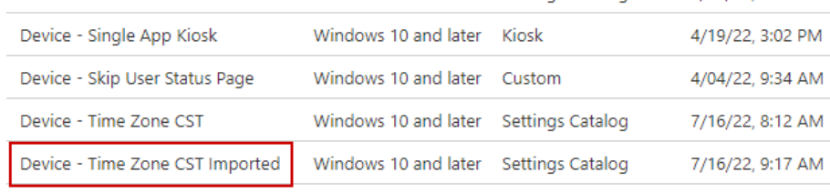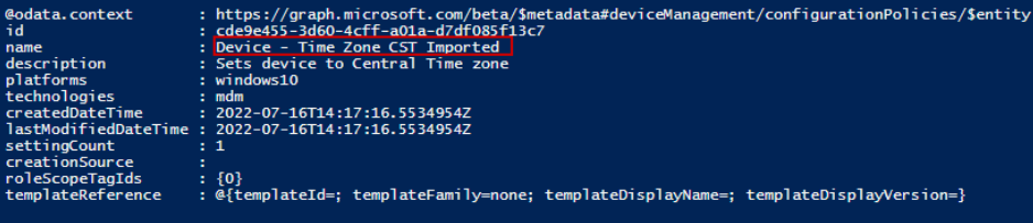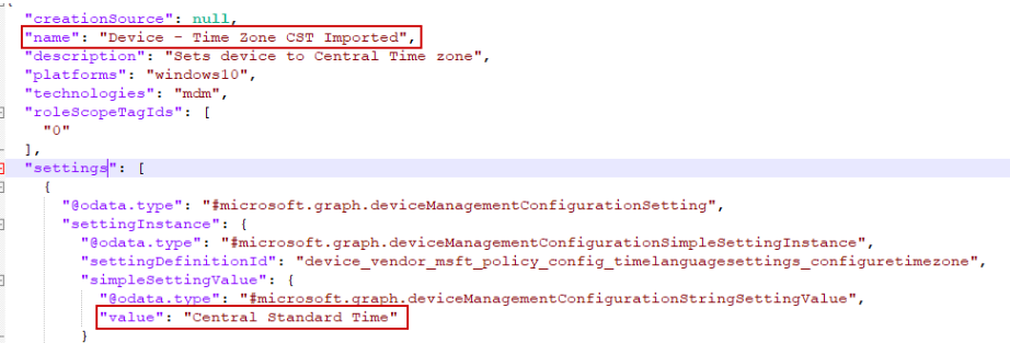The next part of the script will import the JSON and create a new Settings configuration policy. For the sake of testing, I edited the JSON and changed the name to have “Imported” added to the end, and set it back to central time. You can edit the JSON to adjust settings prior to your import if you’d like: