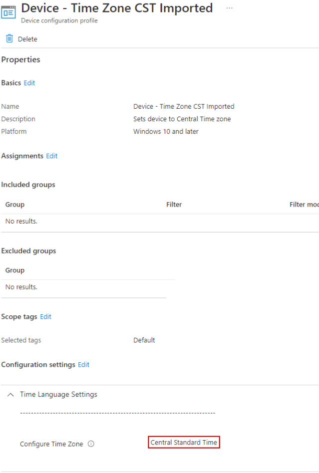 And lastly, the policy showing central time where we changed it in the JSON file prior the import. Note: imported profiles will not be assigned to any groups: