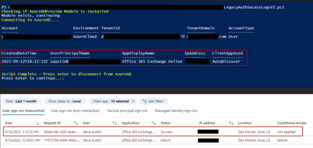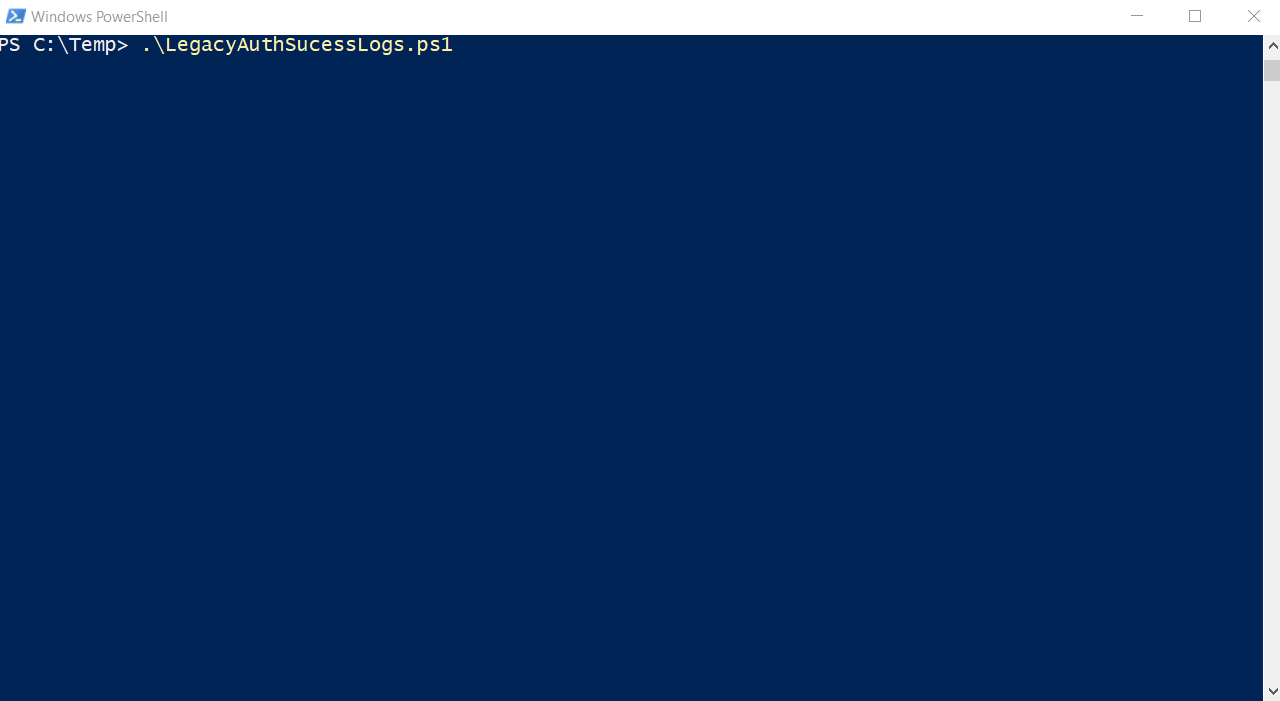 I generated some dummy legacy authentication attempts in my dev tenant. One successful, and one failure to show something in the output. Script in action is below: